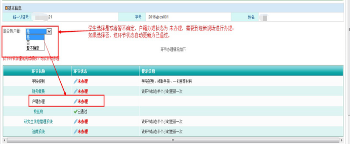 研究生新生根据自身情况,选择是否需要转移户口,完成选择后,下方该环节办理情况会进行同步更新。如下图: