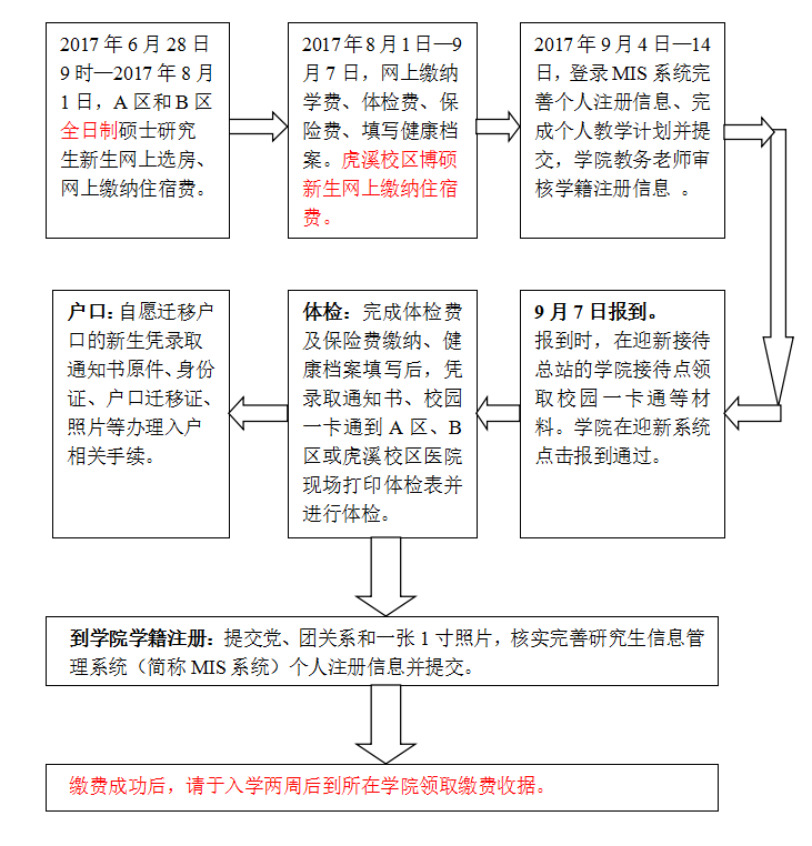 ②住宿费网上缴纳开通时间为2017年6月28日早上9点(详情参见本须知第五条,住宿标准自行选择)。新生报到时,自带录取通知书和一张1寸登记照片到所住宿舍楼值班台办理入住手续。