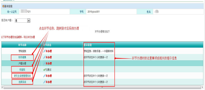 研究生新生在页面查看各个环节办理情况(各个环节办理,无先后顺序,可以并行办理),如下图: